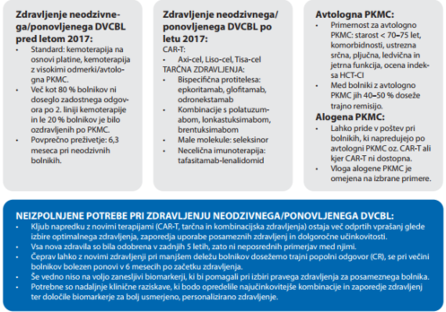 Kljub napredku zdravljenja difuznega velikoceličnega limfoma B (DVCBL) z uvedbo sheme PolaR-CHP zaenkrat ni dokazov o izboljšanem celokupnem preživetju pri bolnikih, ki so primarno neodzivni ali se jim bolezen kmalu po zdravljenju z R-CHOP ponovi. Pri pomembnem deležu bolnikov nadaljnje zdravljenje ostaja izziv zaradi agresivnosti bolezni in komorbidnosti. Kakšna je učinkovitost terapij CAR-T in drugih novejših pristopov?
